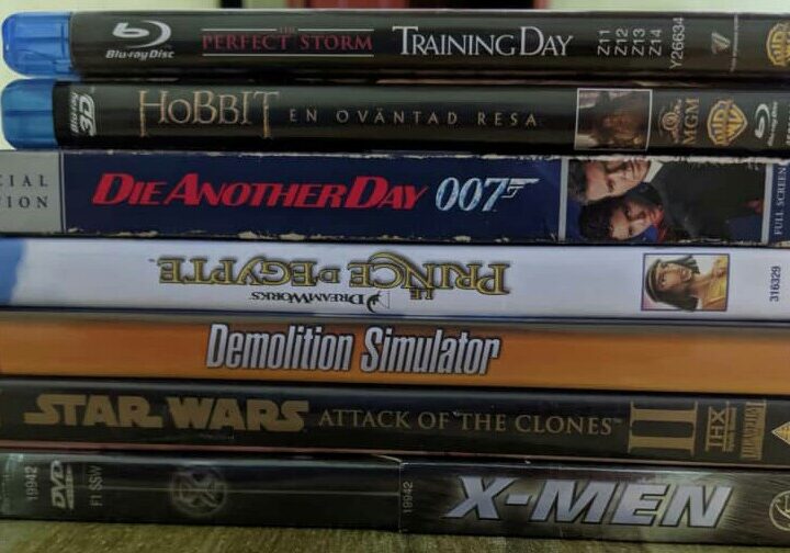 Lot de 7 DVDs et Blurays : – Die another day 007 ; – The perfect storm ; – Star wars 2 ; – Le prince d’Égypte ; – The Hobbit 3D ; – Demolition simulation.